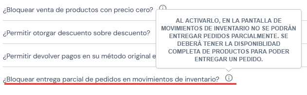 Nuevo permiso en Ajustes / Personalización / Personalización de procesos para bloquear la entrega parcial de pedidos en la pantalla de Movimientos de Inventario.